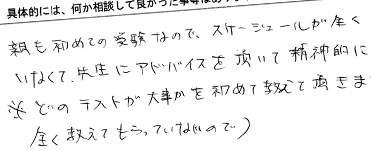 親も初めての受験なのでスケジュールが全く理解出来ていなくて、先生にアドバイスを頂いて精神的に安心出来ました。