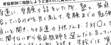 友達に受験の話をした所、塾と家庭教師のどちらが自分の子供に合っているのかを良く考えて受験までの勉強に取り組ませてあげた方が良いと聞き、その友達の子供さんも1対多人だと先生に分からないことを自主的に聞けないから家庭教師を選んだと・・・