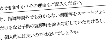 指導時間外でも分からない問題をスマートフォンで写し送信することでアドバイスをいただけるなど子供の就寝時を除き対応していただけるし、勉強についての相談も親身になって聞いてくださるので個人的には良いのではないでしょうか。