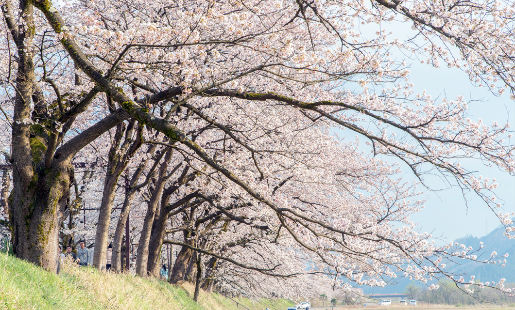 写真は、勝山市の九頭竜川河畔に咲く弁天桜並木です。